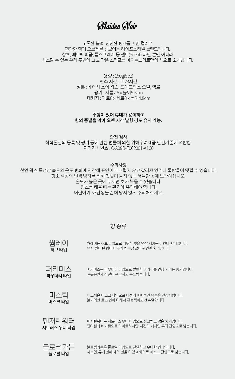 천연 왁스 특성상 습도와 온도 변화에 민감해 표면이 매끄럽지 않고 갈라져 있거나 물방울이 맺힐 수 있습니다. 이는 교환, 환불이 어렵습니다. 수축, 응고로 인하여 왁스 표면이 갈라진 경우는 심지를 연소해 왁스를 1차 녹이고 굳히면 복구됩니다. 색 방지를 위해 햇빛이 들지 않는 서늘한 곳에 보관해주세요. 온도가 높은 곳에 두면 왁스가 녹을 수 있습니다. 심지 연소 시에는 환기에 신경 써주세요. 3시간 이내로 태워주세요. 어린아이, 애완동물 주변에 닿지 않게 주의해주세요.