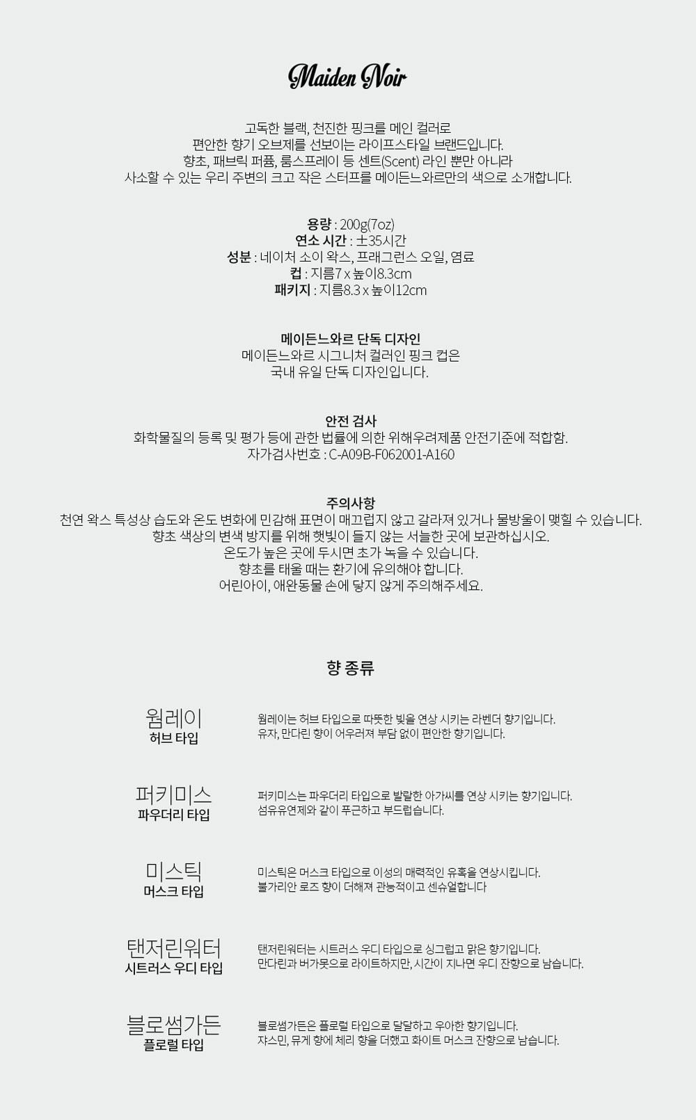 천연 왁스 특성상 습도와 온도 변화에 민감해 표면이 매끄럽지 않고 갈라져 있거나 물방울이 맺힐 수 있습니다. 이는 교환, 환불이 어렵습니다. 수축, 응고로 인하여 왁스 표면이 갈라진 경우는 심지를 연소해 왁스를 1차 녹이고 굳히면 복구됩니다. 색 방지를 위해 햇빛이 들지 않는 서늘한 곳에 보관해주세요. 온도가 높은 곳에 두면 왁스가 녹을 수 있습니다. 심지 연소 시에는 환기에 신경 써주세요. 3시간 이내로 태워주세요. 어린아이, 애완동물 주변에 닿지 않게 주의해주세요.